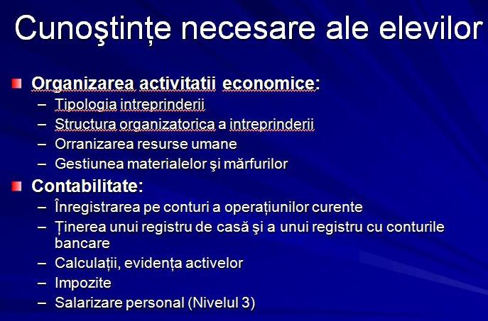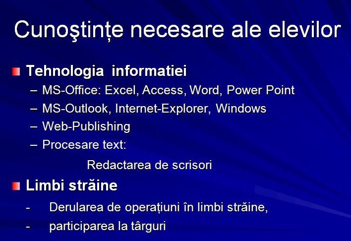 Cunostinţe de specialitate: Cunoaştere teoretică verificată prin training on the job Cunoştinţe metodice: În calitate de „coîntreprinzător“ să înveţe activităţile întreprinderii, paşii de decizie, ca si paşii de lucru Competenţe lingvistice - îmbunătăţite prin relaţiile de afaceri cu partenerii din ţară şi din străinătate Orientare spre clienţi
